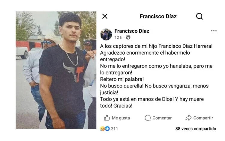 En su mensaje, Francisco Díaz agradeció a quienes entregaron el cuerpo de su hijo, palabras que rápidamente se viralizaron por la crudeza, resignación y dolor que transmiten: