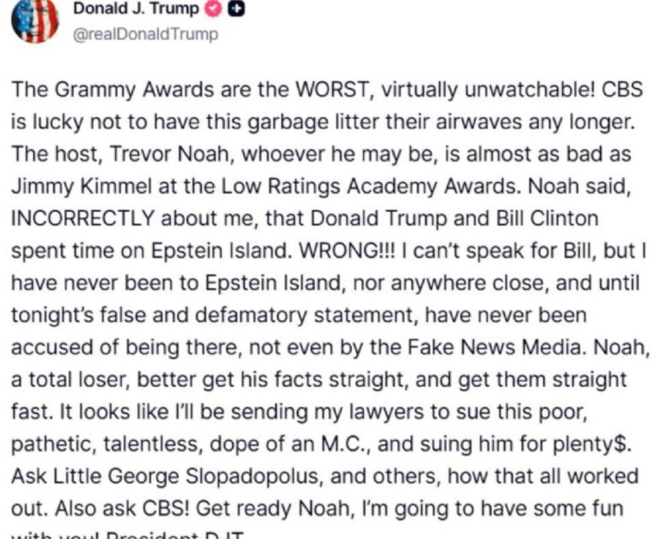 Washington, D.C.– El presidente de Estados Unidos, Donald Trump, arremetió este 2 de febrero contra la ceremonia de los Premios Grammy 2026 y lanzó una amenaza de demanda contra el comediante Trevor Noah y la cadena CBS, luego de un chiste que lo vinculó con la isla de Jeffrey Epstein durante la transmisión.