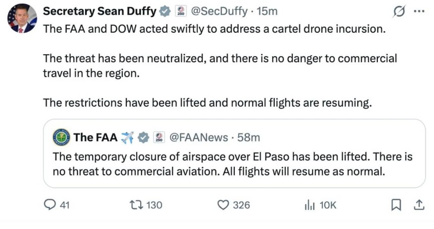 En una publicación en la red social X, el funcionario detalló que la FAA y el Departamento de Defensa “actuaron con rapidez para atender una incursión de drones de un cártel. La amenaza ha sido neutralizada y no hay peligro para los viajes comerciales en la región”.