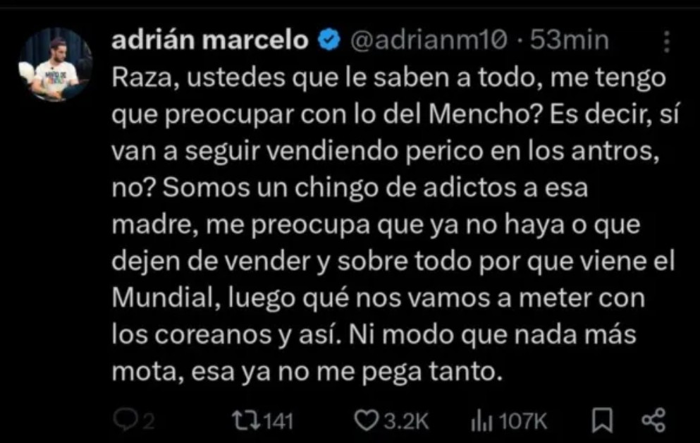 El influencer y comediante Adrian Marcelo generó polémica luego de publicar una serie de comentarios en la plataforma X donde ironizaba sobre el impacto que tendría la muerte del líder criminal en el consumo de drogas en el país.