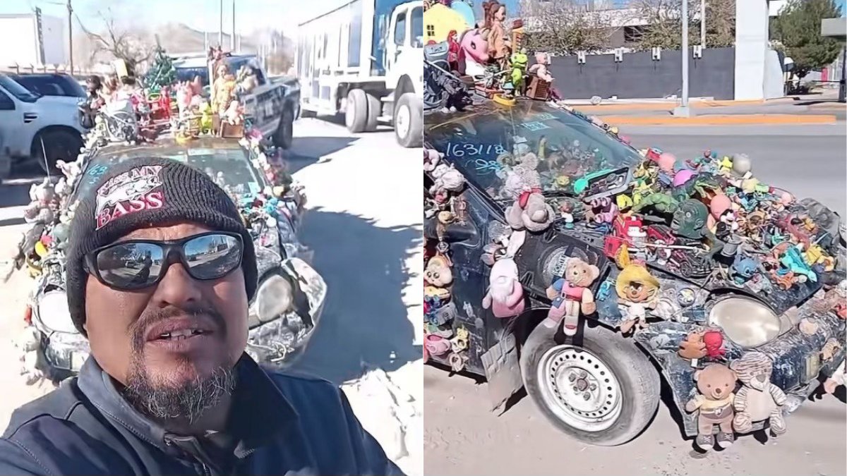 El llamado carro peluche es un Chrysler Neon de modelo antiguo, que se volvió viral en Ciudad Juárez por estar completamente cubierto con decenas de peluches y juguetes, desde la carrocería hasta los espejos y la cajuela.