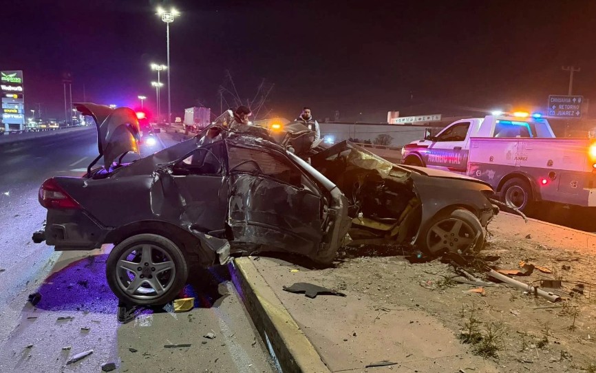 Tras el impacto, el automóvil fue proyectado contra el camellón central y un poste con cinco luminarias de alumbrado público, propiedad del Municipio de Juárez.