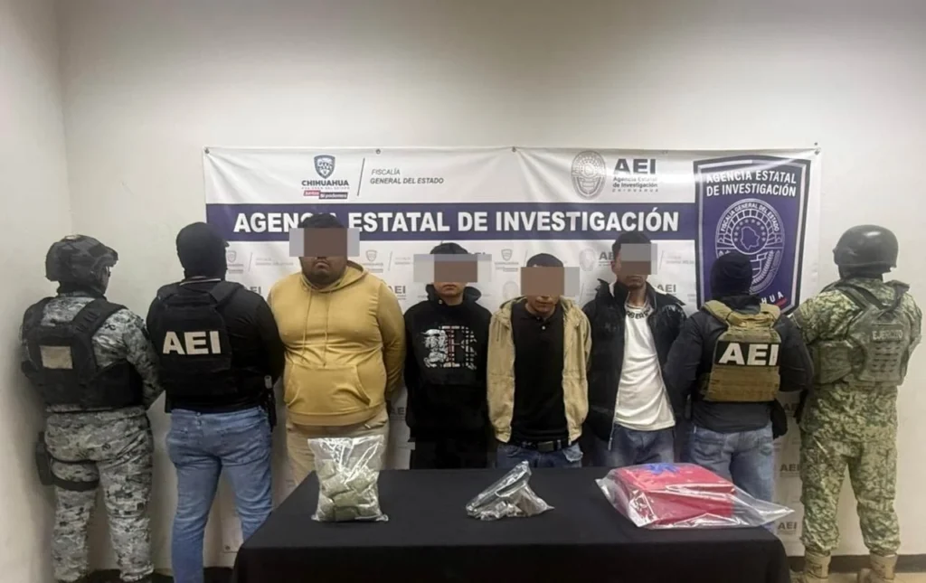 Ciudad Juárez.– Elementos de la Agencia Estatal de Investigación (AEI) detuvieron a cuatro hombres durante un cateo realizado en una vivienda de la colonia Cerradas del Ángel, donde además aseguraron droga y un arma de fuego.