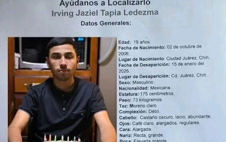 La Fiscalía de Distrito Zona Norte confirmó la identidad del joven localizado sin vida el pasado 26 de enero de 2026 al interior de una escuela abandonada en la colonia Infonavit Solidaridad, en Ciudad Juárez. Se trata de Irving Jaziel Tapia Ledezma, de 19 años, quien había sido reportado como desaparecido desde el 15 de enero.