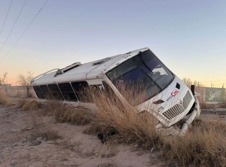 Ciudad Juárez, Chihuahua. — Un camión de transporte de personal que presuntamente era conducido a exceso de velocidad salió del camino y cayó a una canaleta en el fraccionamiento Riberas del Bravo, etapa VIII, durante la madrugada, informaron autoridades viales.