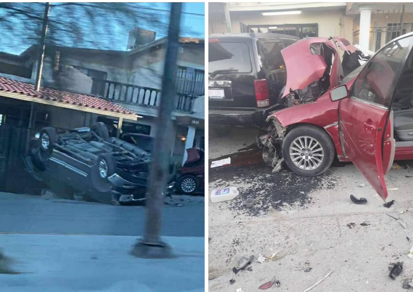 Ciudad Juárez.– Un aparatoso choque múltiple con volcadura registrado la mañana de este sábado en la avenida División del Norte, a la altura de la calle Oro, dejó cuantiosos daños materiales luego de que uno de los conductores presuntamente se quedara dormido al volante.