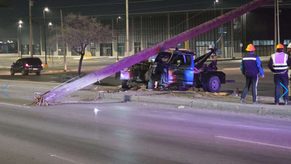 Ciudad Juárez, Chihuahua. — Un fuerte accidente vial se registró en el cruce del Libramiento Aeropuerto y la calle Hermanos Soler, luego de que el operador de una grúa, presuntamente a exceso de velocidad, perdiera el control de la pesada unidad y derribara dos postes de la Comisión Federal de Electricidad.