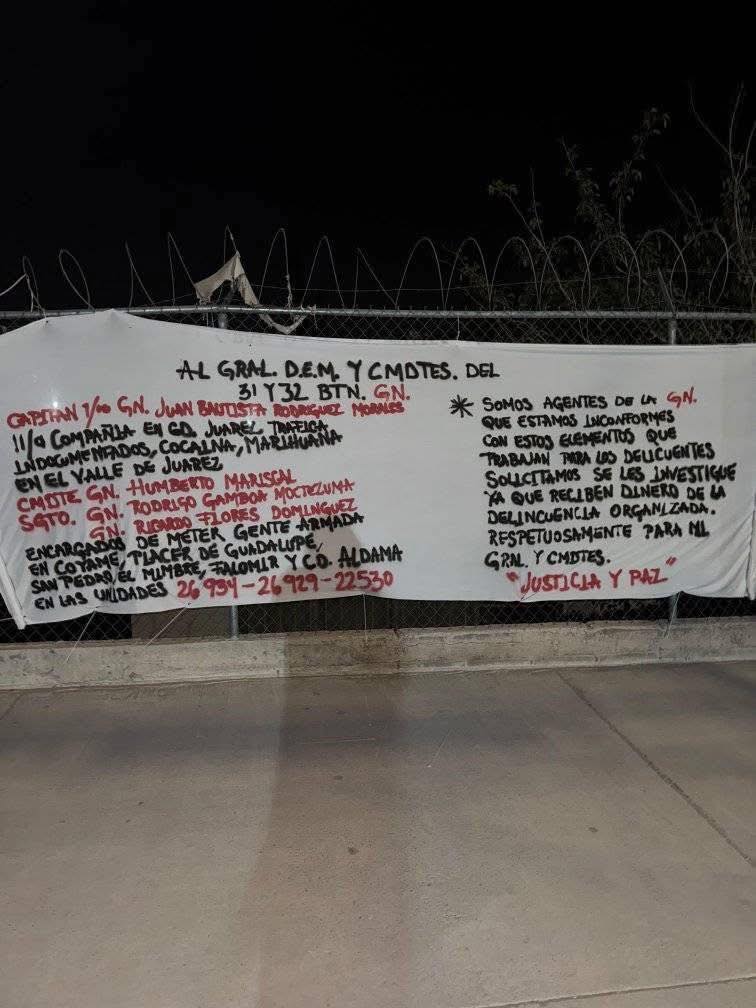 El texto, colocado sobre una malla ciclónica en el cruce de las calles Pavo Real y Octava, señala directamente a varios comandantes y sargentos de los batallones 31 y 32 de la Guardia Nacional, acusándolos de brindar apoyo a un grupo criminal que opera en el Valle de Juárez.