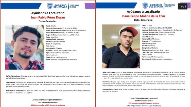 Ascensión, Chihuahua.– La Fiscalía General del Estado solicitó el apoyo de la ciudadanía para localizar a Juan Pablo Pérez Durán y Josué Felipe Molina de la Cruz, ambos de 21 años de edad, quienes fueron reportados como desaparecidos en el municipio de Ascensión, sin que hasta el momento se tenga información sobre su paradero.