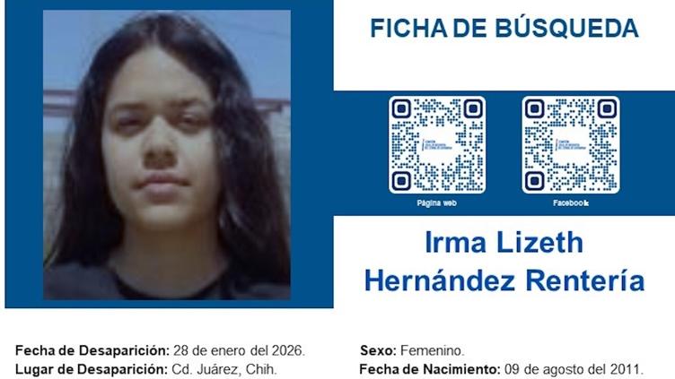 Ciudad Juárez.– La Fiscalía General del Estado (FGE) solicitó el apoyo de la ciudadanía para localizar a Irma Lizeth Hernández Rentería, una adolescente de 14 años reportada como desaparecida en Ciudad Juárez.