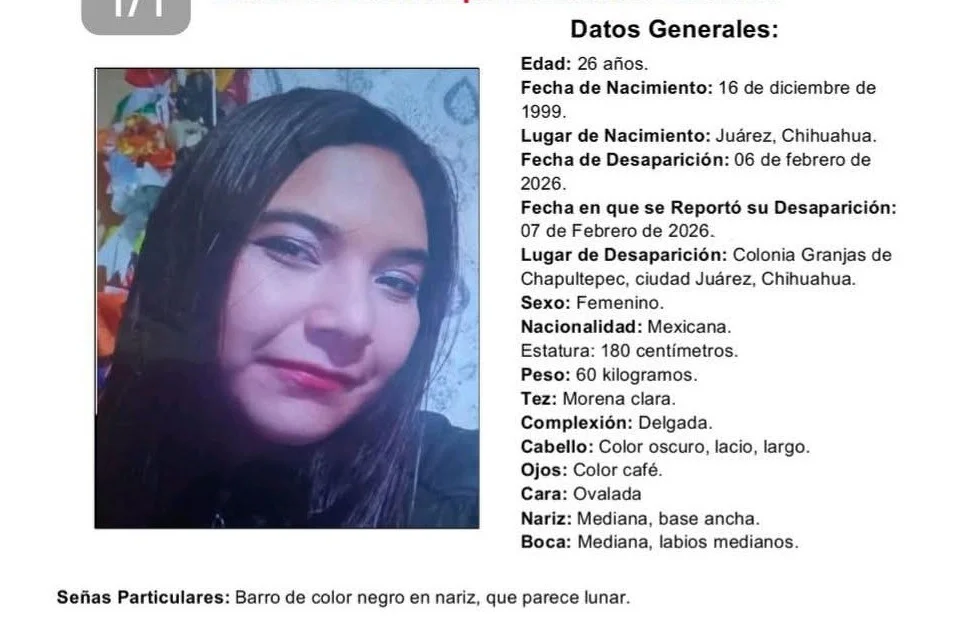 Ciudad Juárez.– La Fiscalía General del Estado solicitó el apoyo de la ciudadanía para localizar a Josseline Guadalupe Castañeda Godínez, de 26 años de edad, quien fue reportada como desaparecida en Ciudad Juárez desde el pasado 6 de febrero de 2026.