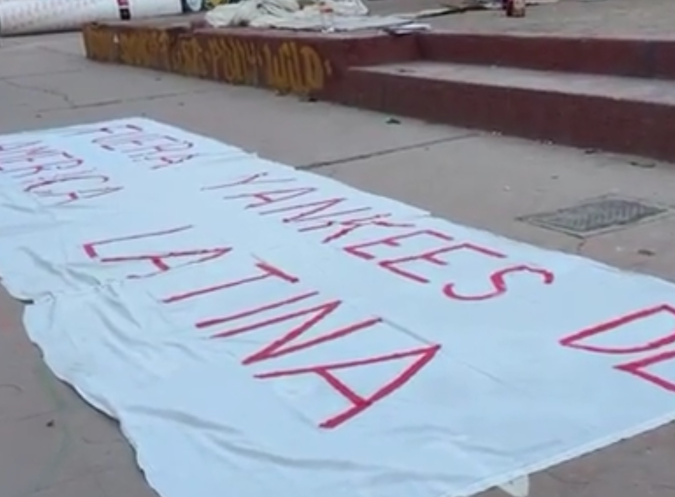 La movilización reunió a menos de 10 integrantes del colectivo Red Frontera Palestina, quienes pintaron lonas y carteles con mensajes en contra del intervencionismo estadounidense y la presunta captura del presidente Nicolás Maduro y su esposa.
