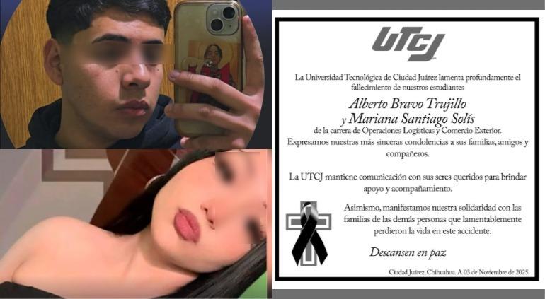 Ciudad Juárez.– La Universidad Tecnológica de Ciudad Juárez (UTCJ) lamentó el fallecimiento de Alberto Bravo Trujillo y Mariana Santiago Solís, jóvenes estudiantes de la institución que perdieron la vida en el trágico accidente ocurrido el pasado domingo 2 de noviembre en el cruce de la avenida Tecnológico y calle Centeno.