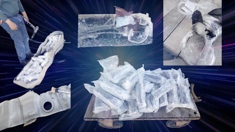 Tras una revisión minuciosa, los oficiales localizaron 32 paquetes ocultos que contenían 59.5 libras de fentanilo y metanfetamina.