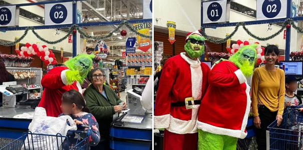 CIUDAD JUÁREZ.– Lejos de la imagen del personaje que odia la Navidad, dos jóvenes disfrazados del Grinch protagonizaron un emotivo gesto solidario que conmovió a decenas de familias juarenses durante las compras de la temporada decembrina.