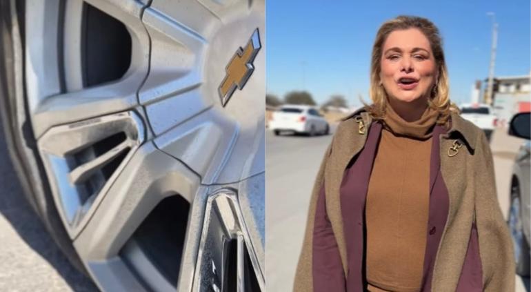 La gobernadora de Chihuahua exhibió el daño a su camioneta y criticó el estado de las calles durante una visita oficial a la frontera.