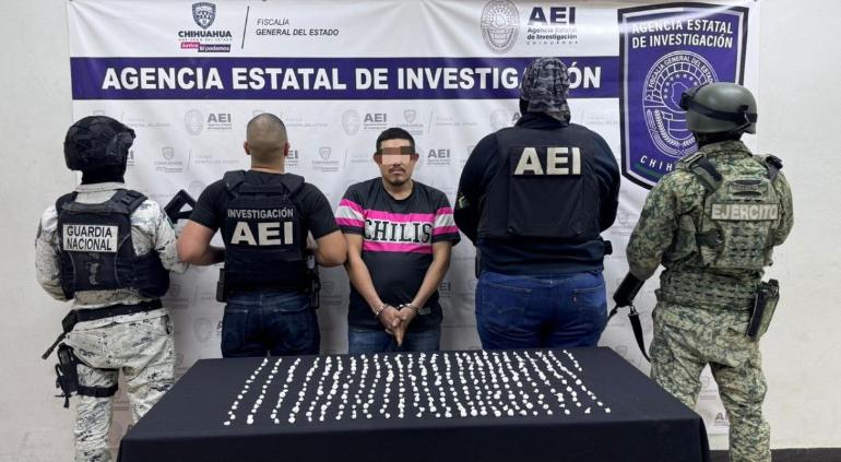 Ciudad Juárez, Chihuahua.– La Fiscalía General del Estado de Chihuahua informó la detención en flagrancia de Jorge Luis Z. S., de 32 años, tras asegurarle 353 envoltorios con metanfetamina, conocida comúnmente como cristal.
