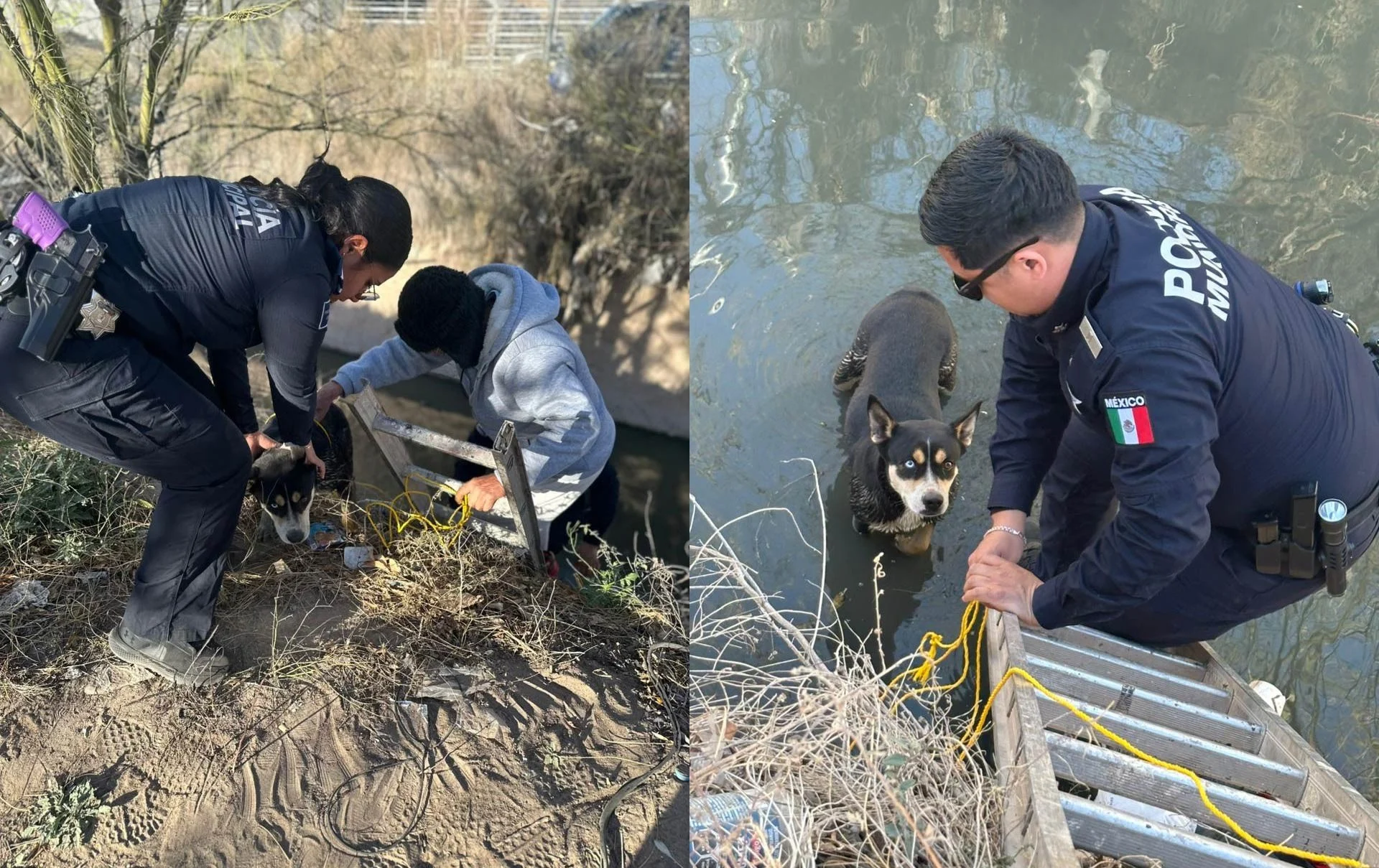 Ciudad Juárez, Chihuahua.– Elementos de la Secretaría de Seguridad Pública Municipal (SSPM), adscritos a la Estación de Policía del Distrito Centro, realizaron el rescate de un perro que se encontraba atrapado en un canal de aguas negras en la colonia Bellavista.