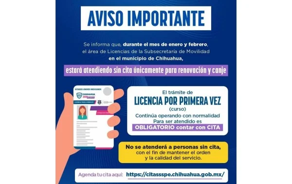 Chihuahua.– La Secretaría de Seguridad Pública del Estado (SSPE) informó que durante los meses de enero y febrero los trámites de renovación de licencias de conducir se atenderán sin necesidad de cita previa, con el objetivo de agilizar el servicio y reducir tiempos de espera para la ciudadanía.