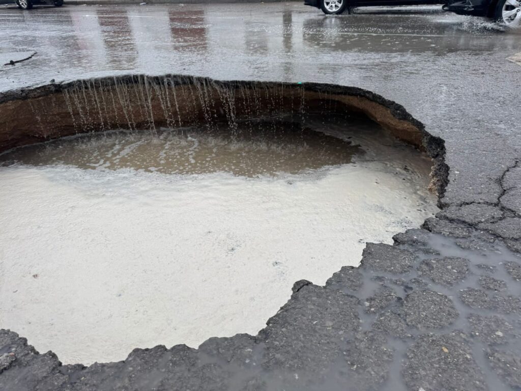 Ciudad Juárez.— La Coordinación de Seguridad Vial alertó a los automovilistas luego de que, a causa de las fuertes lluvias registradas este sábado, se abriera un socavón sobre la avenida Santiago Troncoso.