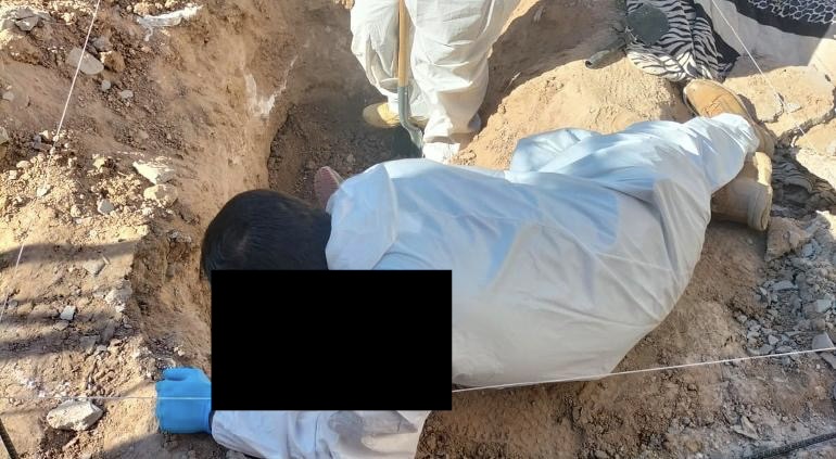 Tras la señalización del perro especializado, personal pericial procedió a realizar trabajos de excavación, confirmando la presencia de restos humanos enterrados de manera clandestina.