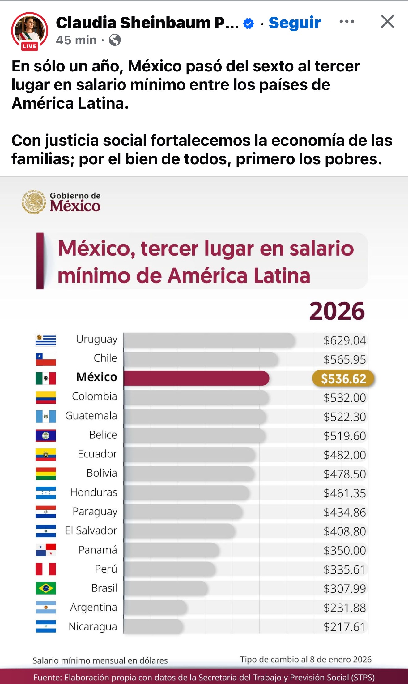 El comparativo fue elaborado con datos de la Secretaría del Trabajo y Previsión Social (STPS) y considera el tipo de cambio vigente al 8 de enero de 2026. Desde el Ejecutivo federal se reiteró que la política de aumentos continuará, especialmente en regiones estratégicas como la Zona Libre de la Frontera Norte, donde el salario mínimo es superior al del resto del país.