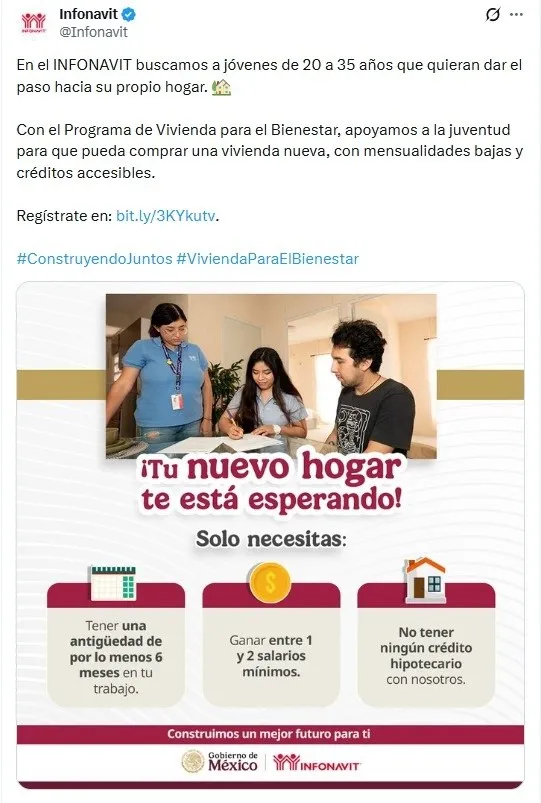 Ciudad de México.– El Instituto del Fondo Nacional de la Vivienda para los Trabajadores (Infonavit) mantiene activo el programa Vivienda para el Bienestar, una estrategia enfocada en jóvenes de entre 20 y 35 años que buscan adquirir su primera vivienda mediante créditos accesibles, requisitos flexibles y mensualidades bajas.