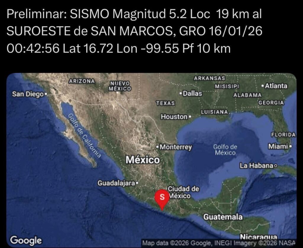 De acuerdo con el reporte oficial, el sismo se localizó a 17 kilómetros al suroeste de San Marcos, en el estado de Guerrero, lo que permitió la activación oportuna de la alerta sísmica en la Ciudad de México.