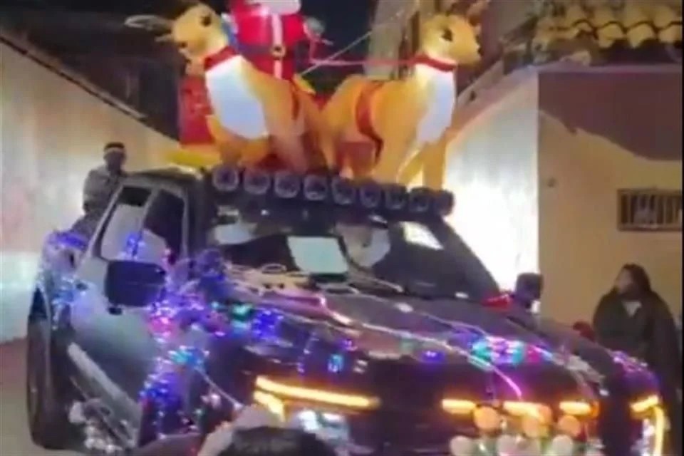 En uno de los vehículos se observa incluso a un sujeto disfrazado de Santa Claus, quien participa activamente en la entrega de dulces, mientras otros integrantes del grupo criminal resguardan la caravana con armas visibles. La escena mezcla símbolos tradicionales de las fiestas decembrinas con la presencia explícita del crimen organizado, lo que ha generado preocupación entre especialistas y autoridades.