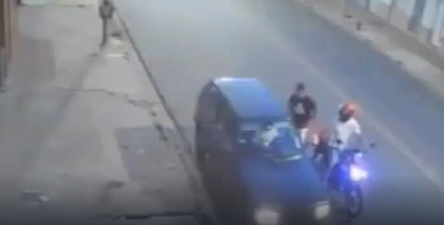 El agresor intenta rodear el vehículo para cerrar el paso al conductor; sin embargo, el automovilista acelera y logra huir, obligando a los ladrones a replegarse. Segundos después, el conductor da marcha atrás a alta velocidad y embiste la motocicleta cuando los asaltantes intentaban retirarse.