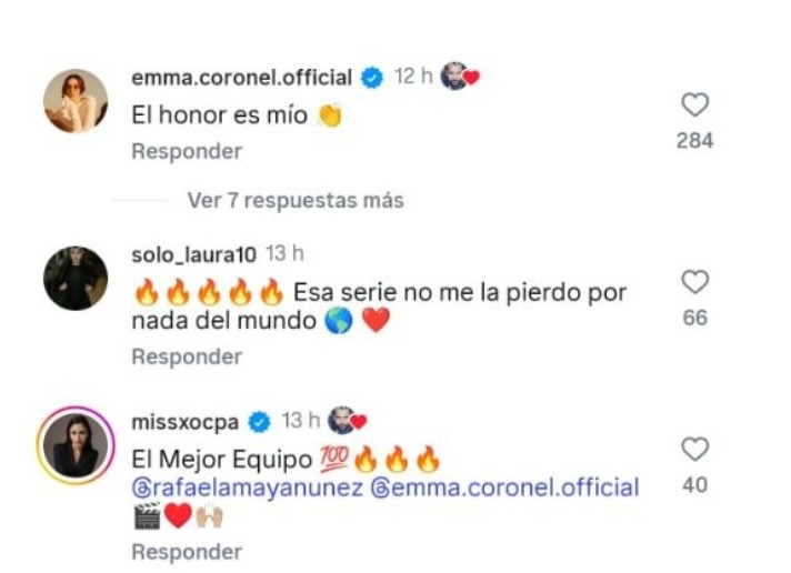Tras el anuncio, Rafael Amaya expresó en sus redes sociales: “Es un honor trabajar con Emma Coronel y Maritza en este increíble proyecto. Seguimos construyendo a través de la pasión, la disciplina y el arte”. A este mensaje, Coronel respondió brevemente: “El honor es mío”.
