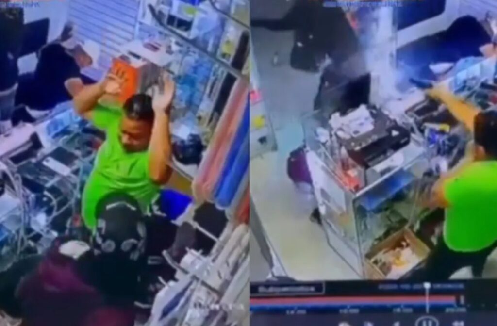 SANTO DOMINGO, RD – Un video captado por cámaras de seguridad se ha vuelto tendencia mundial tras mostrar la violenta reacción de un comerciante ante un asalto. El dueño de un establecimiento de telefonía móvil abatió a tiros a dos presuntos delincuentes que momentos antes habían ingresado a su negocio para despojarlo de mercancía y dinero en efectivo.
