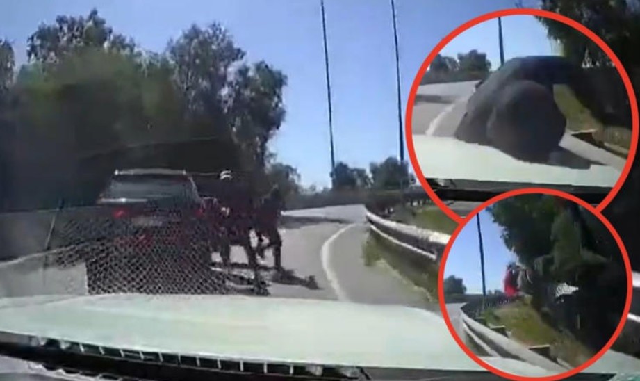 Las imágenes, captadas por cámaras instaladas en el vehículo de la víctima, muestran cómo un automóvil negro le cierra el paso justo en una curva antes de subir a un puente elevado.