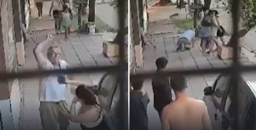 La secuencia quedó registrada por un teléfono celular de una de las víctimas y por cámaras de seguridad del sector. En las imágenes —difundidas por medios locales y redes sociales— se observa al hombre avanzando de manera agresiva con el objeto en alto, mientras otros familiares intentan contener la situación.