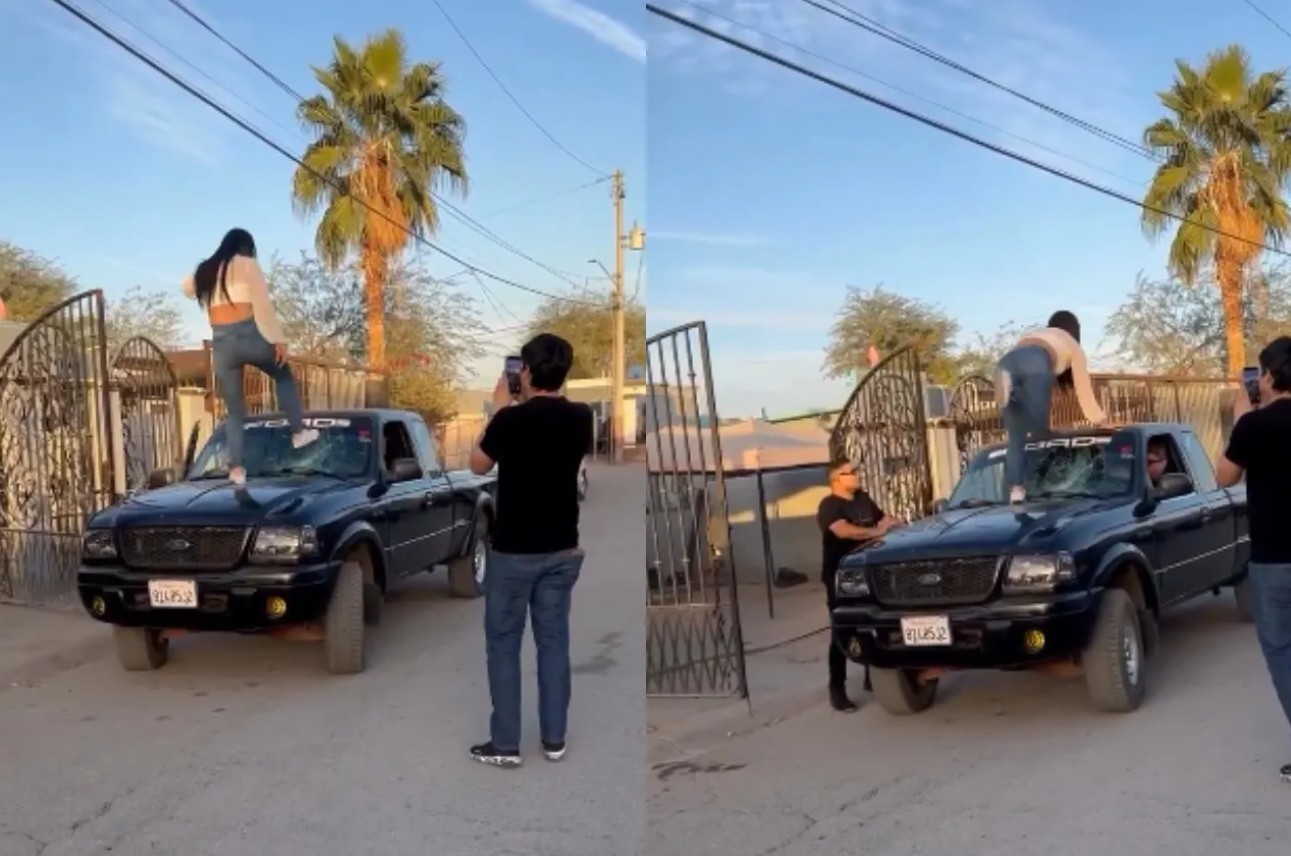 Ciudad Juárez, Chihuahua. — Un video viral volvió a encender el debate en redes sociales al mostrar una escena de celos extremos en plena vía pública: una mujer se sube al cofre de una camioneta tipo pickup y golpea el parabrisas con patadas para impedir que su pareja salga con un amigo.