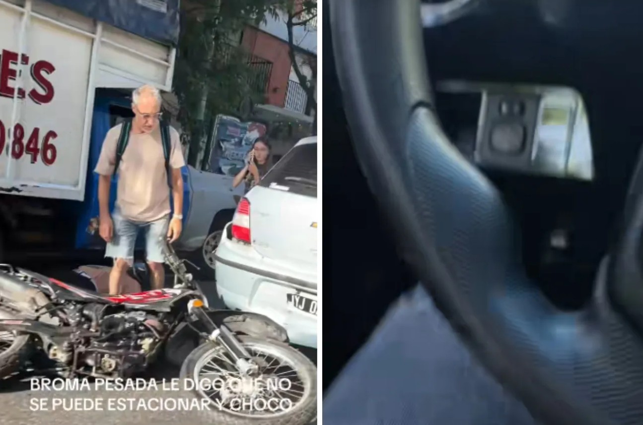 El clip fue publicado por el usuario @santiponticelli, quien circulaba junto a un choque previo entre un automóvil y una motocicleta. Con tono irónico, lanzó la frase: “No se pueden estacionar ahí”, una broma recurrente en redes para mofarse de vehículos accidentados.